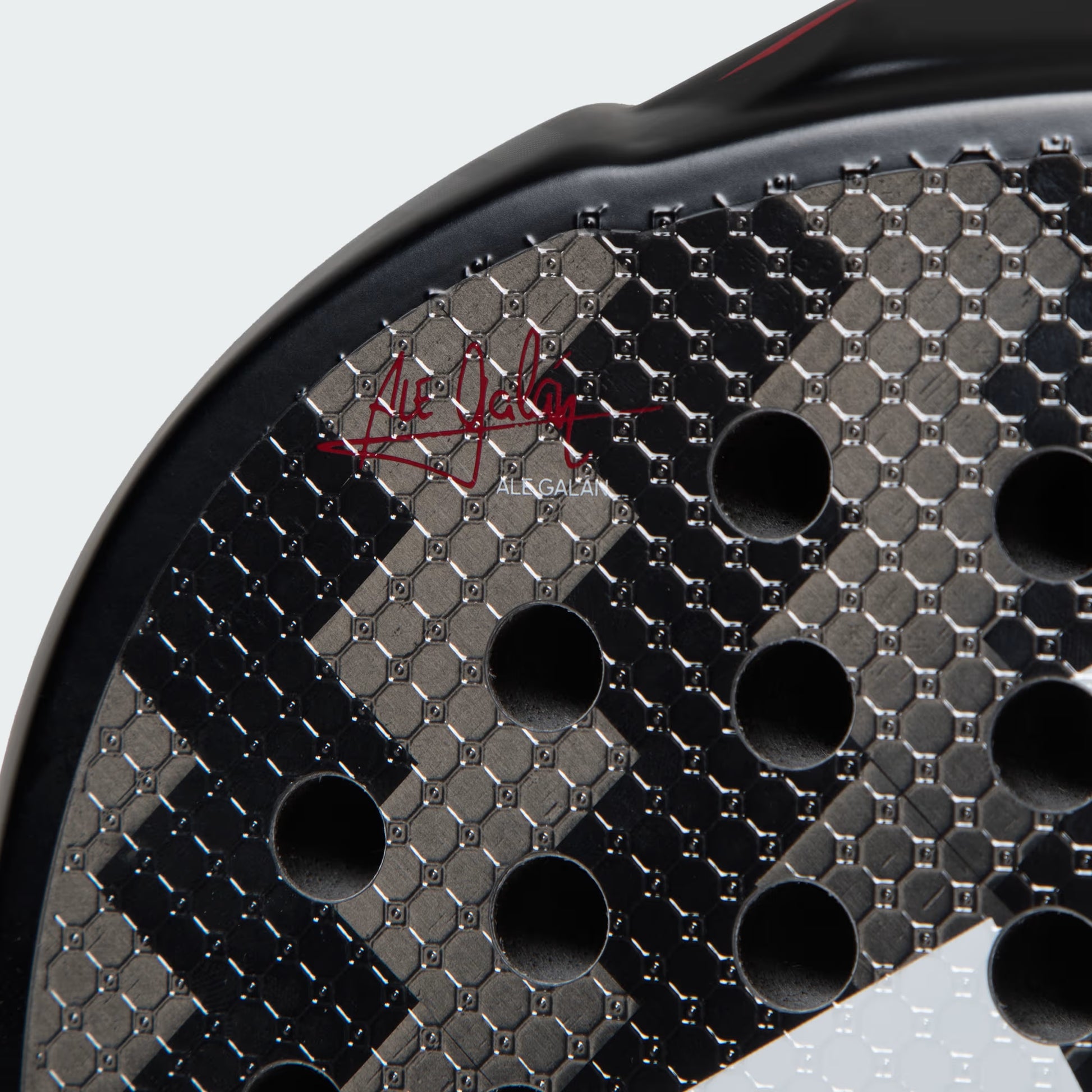 Eleva tu juego con la pala de Ale Galán. Su diseño combina una superficie de fibra de carbono Carbon Aluminised 2-to-1 y un núcleo de suave EVA de alto rendimiento, proporcionando dureza sin sacrificar la mejor comodidad. La tecnología de estructura octogonal agrega un punto extra de rigidez al corazón y marco de la pala. Antes de jugar puedes ajustarla con el sistema de peso y equilibrio, para que puedas tomar decisiones estratégicas. El Spin Blade te permite realizar un rango de efectos de giro gracias a su rugosidad octogonal distribuida en toda la superficie.